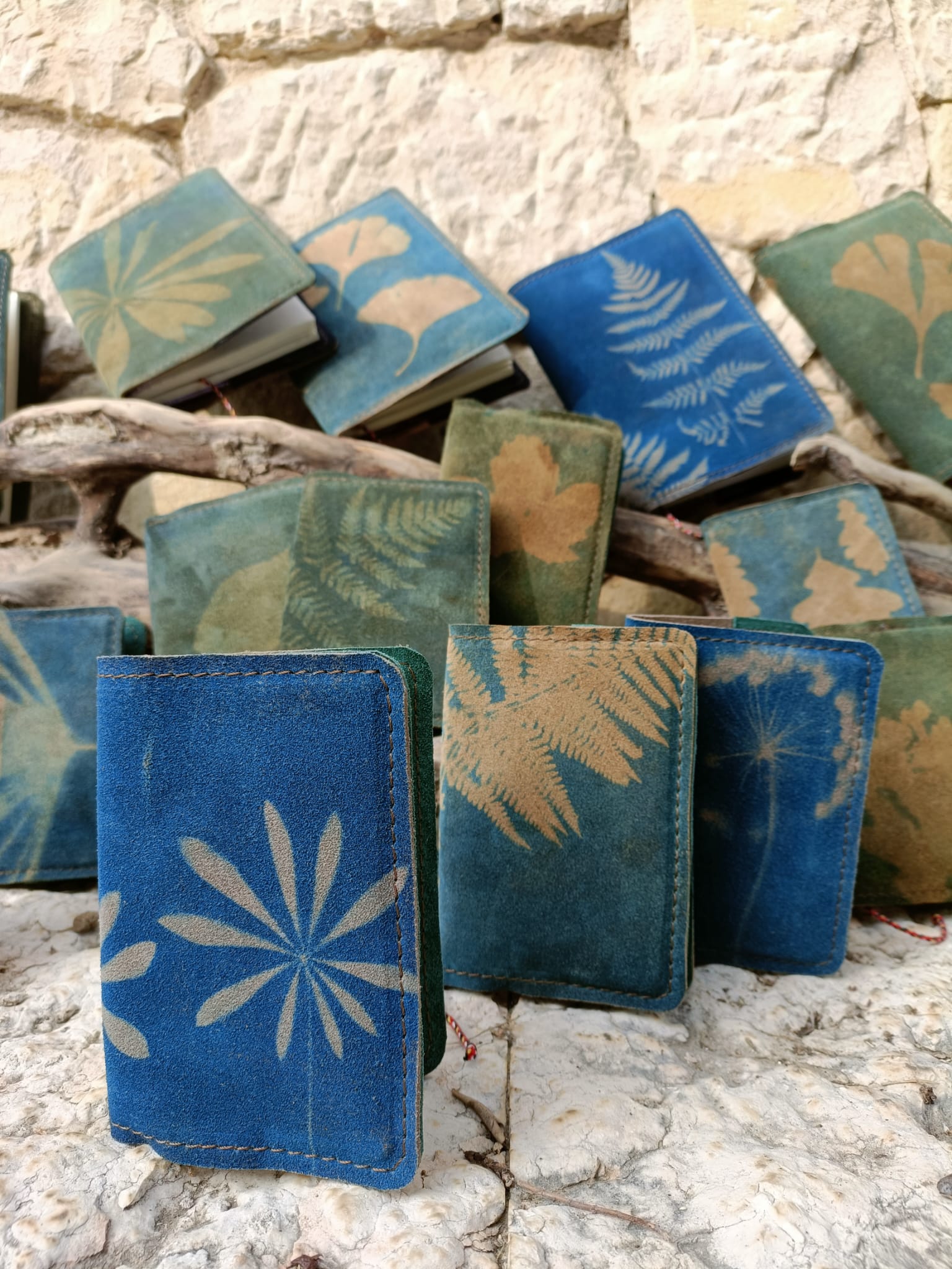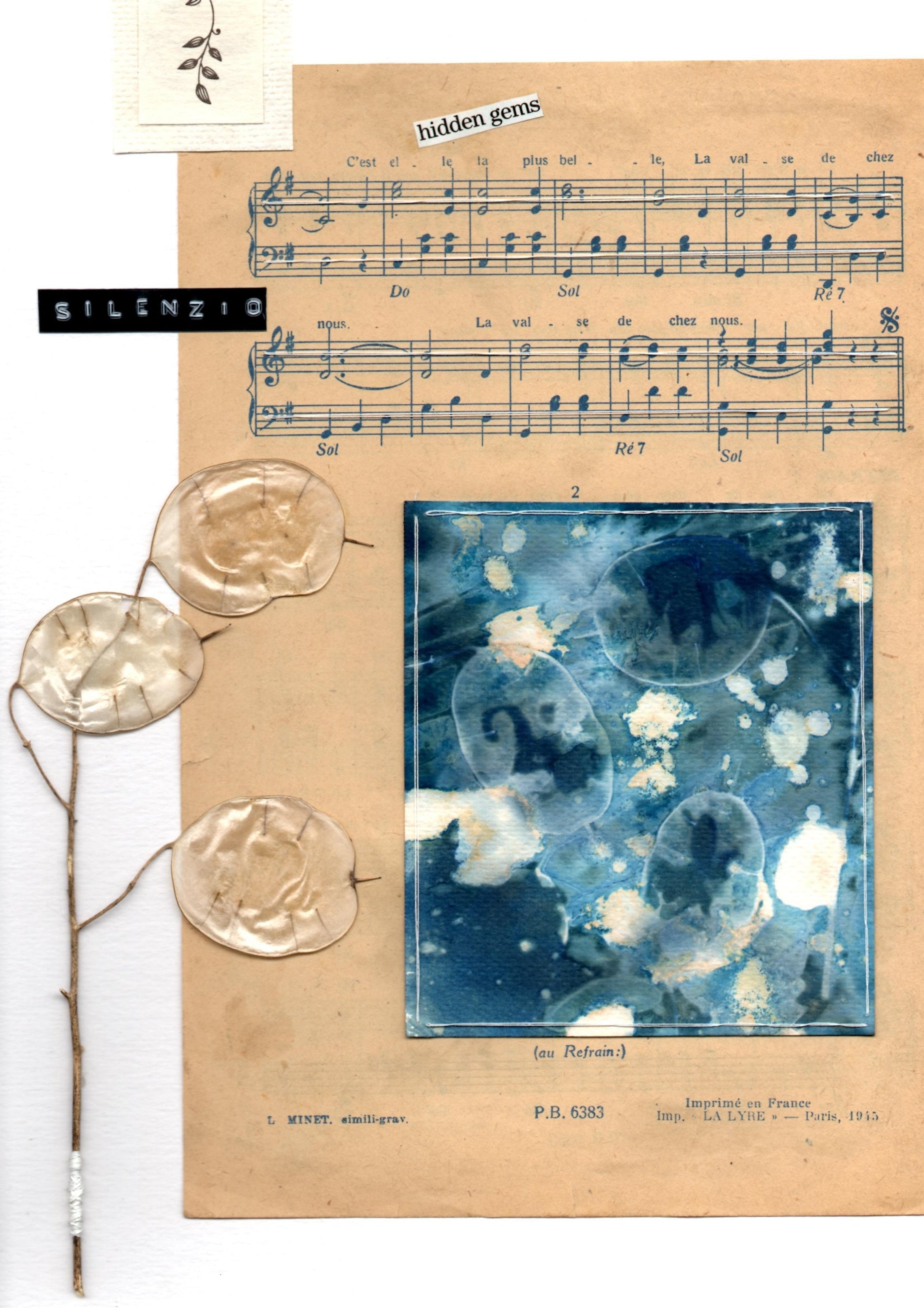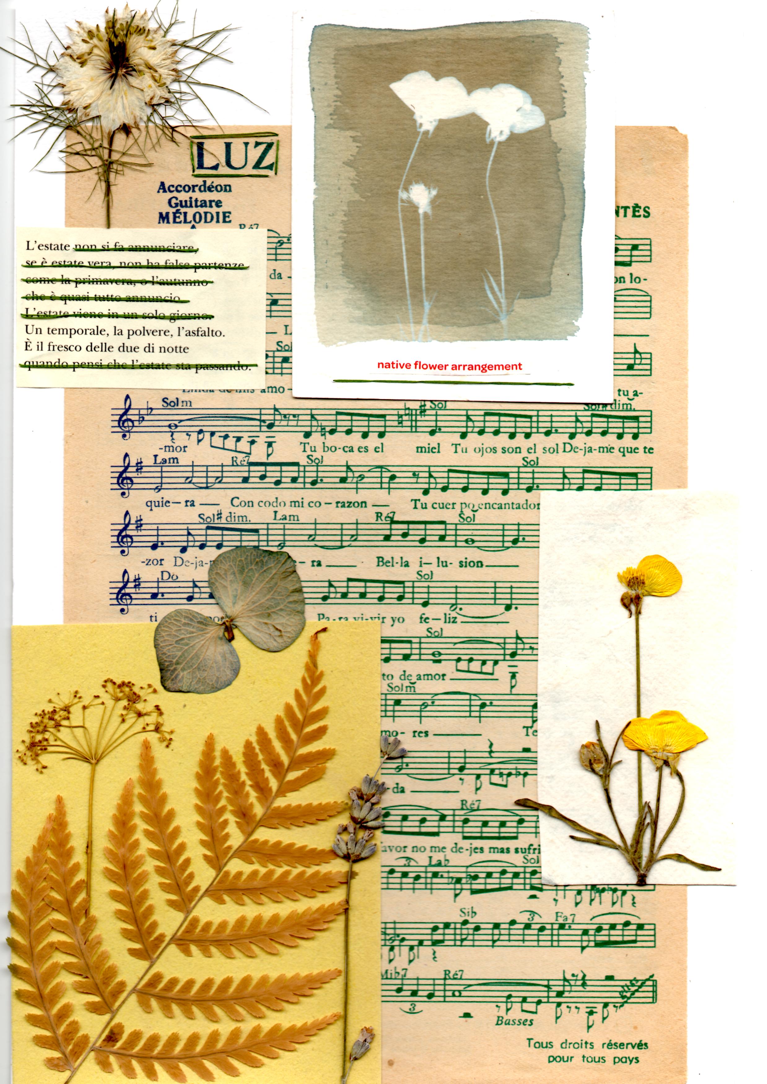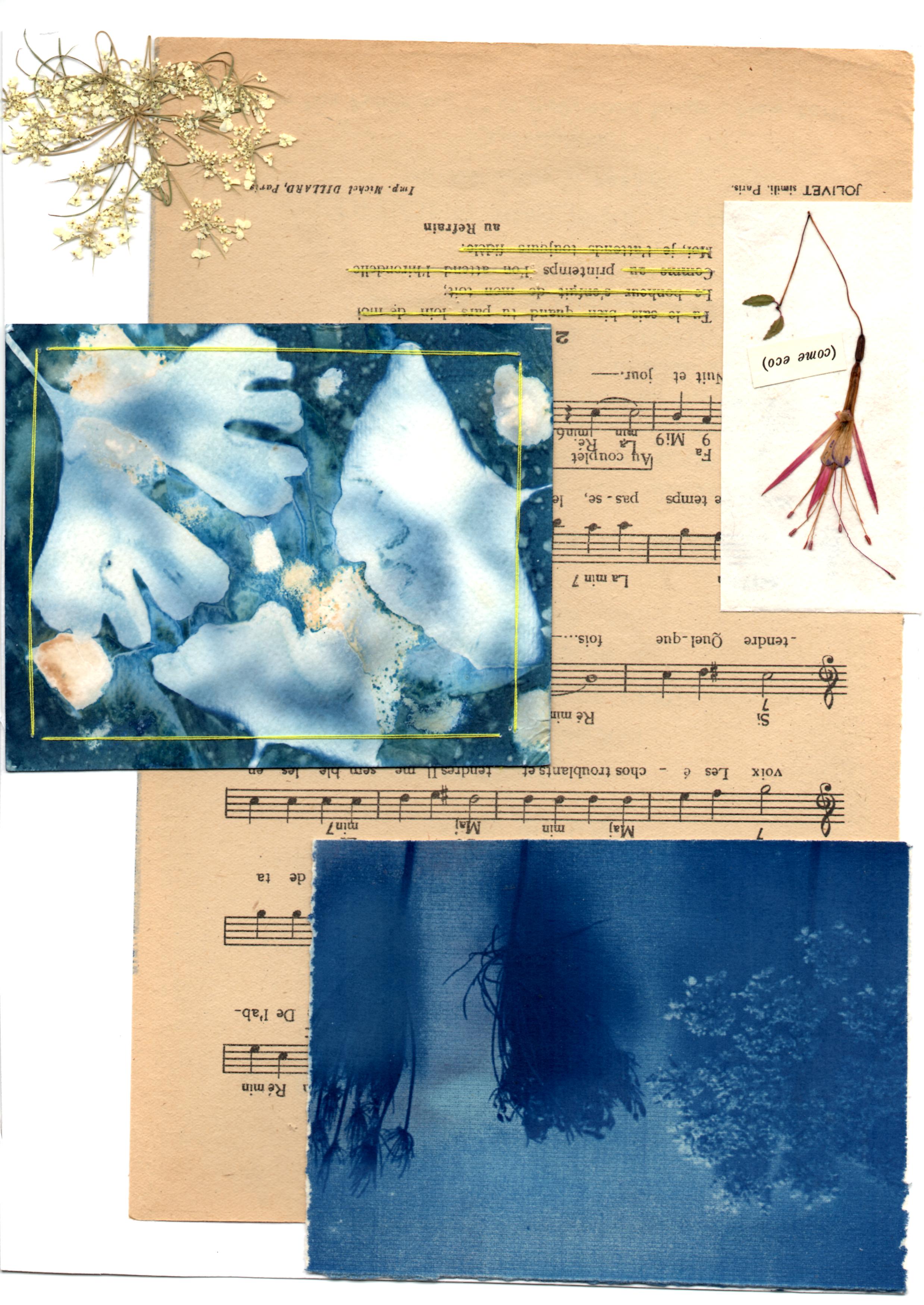 Cianotipie, elementi vegetali, caviardage e parole chiave si mescolano tra loro.